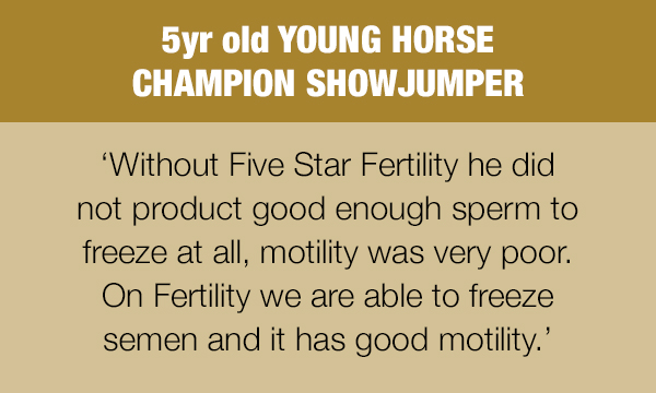 'It's been so rewarding to be involved in the development of Five Star Fertility, designed for every stallion to help them reach their potential. Years in the making, extensive trialling and a unique complex of ingredients has led to an innovative approach to your stallion's fertility.'