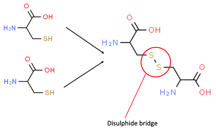 Fig 3: Two molecules of Cysteine (C3H7NO2S) undergoing ‘Oxidative Folding’ to Cystine (C6H12N2O4S2), with the Disulphide bridge highlighted.