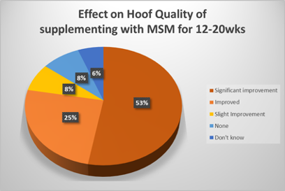 Protocol: The trial was a field trial questionnaire of owners using an MSM complex for health, including for hoof health. Questionnaires were simply sent to horse owners and asked to complete and return. No payment, prize or product in kind was offered for taking part, in order to minimise the risk of bias.