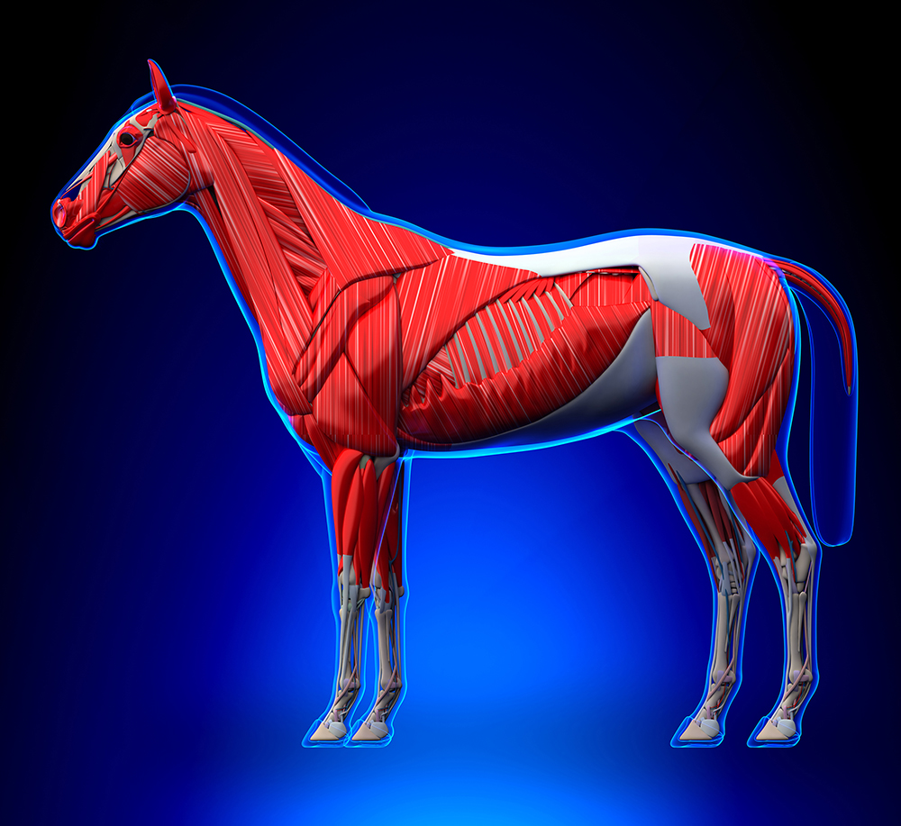 There are 2 main types of muscle in the horse’s body, as there are with us – skeletal (striated) and smooth muscle. Skeletal muscles respond to messages sent from the brain via nerve impulses, they can be actively controlled and coordinated to move body parts - for example limb movement, chewing or tail swishing. Over 50% of the body mass of athletic horses comes from skeletal muscle – so a fit competition horse can easily have over 250kg of lean muscle mass as part of its body weight.