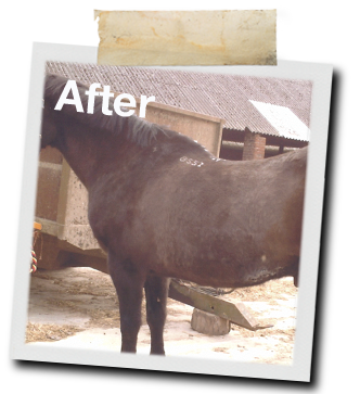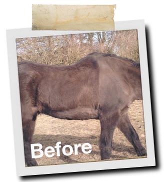 Trial Horse 1, pictured immediately prior to the start of the trial. Trial Horse 1, showing the improvement in Body Condition and Coat Condition following Equine Cushings Syndrome supplement trial.
